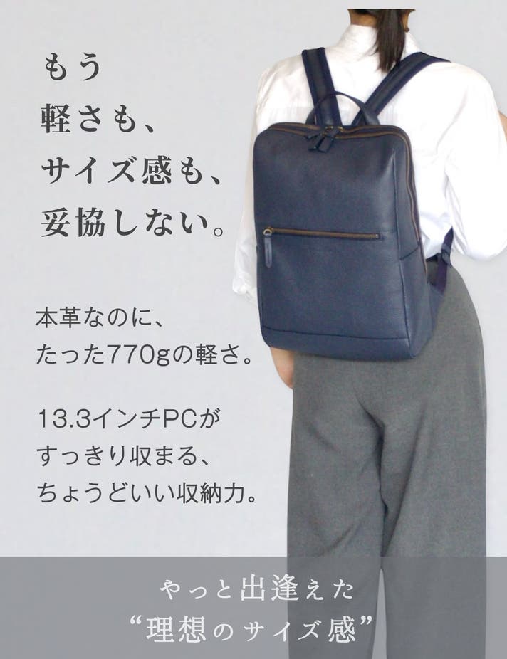 - 重さわずか770g。13インチPCに最適なサイズ感で、毎日軽快に持ち歩ける本革リュック