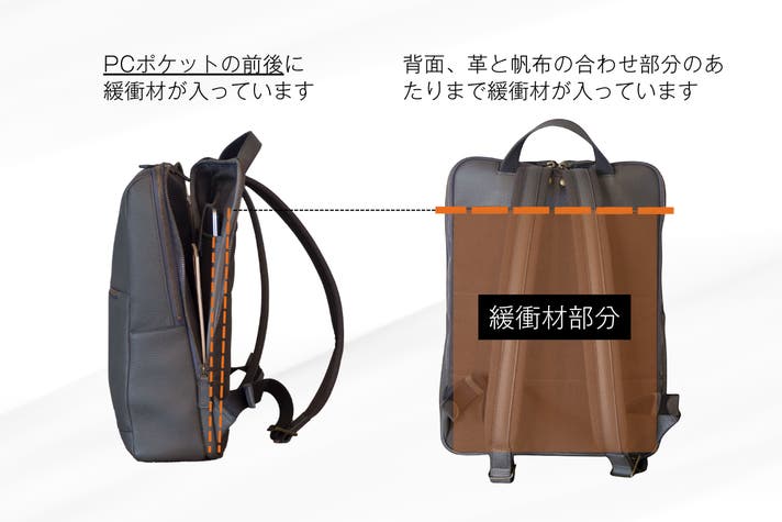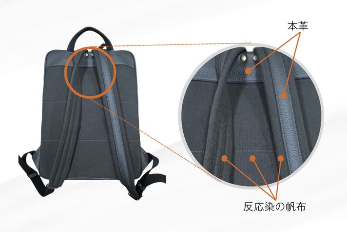 背中部分、リュックのベルトの体側には、吸湿性に優れた帆布を採用。