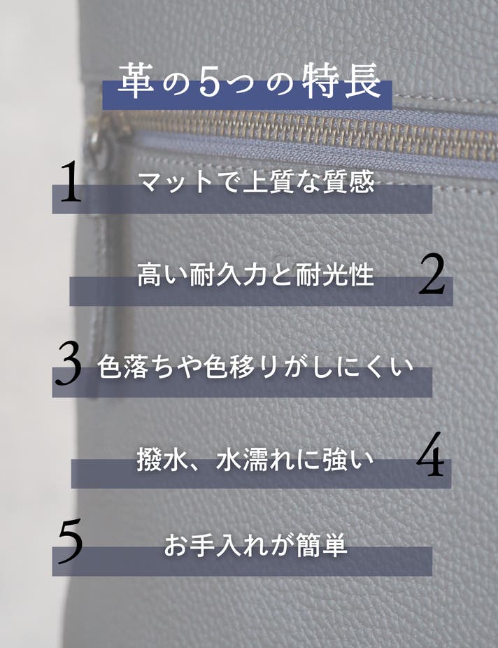 今回のメイン素材となる本革は、大切な商談から日常のワークスタイルまで、あらゆるビジネスシーンに対応できるよう、5つの特長を備えています。