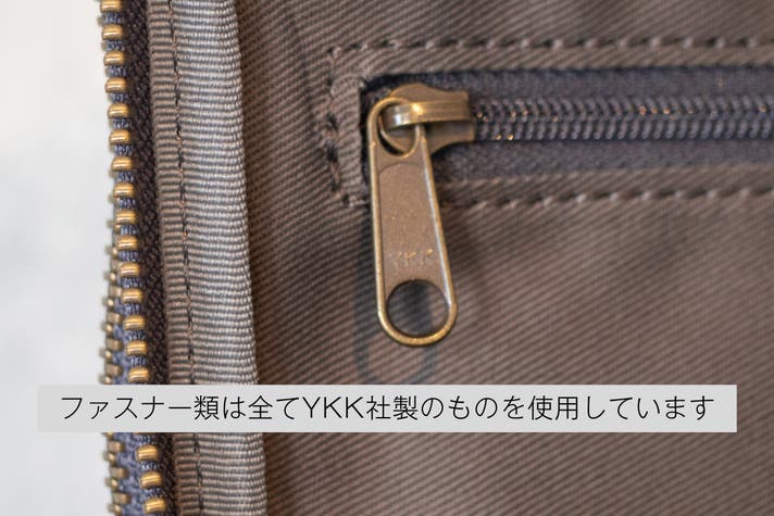 ファスナーは全て信頼のYKK社製を採用。滑りが良くスムーズなので、開閉時のストレスを軽減します。