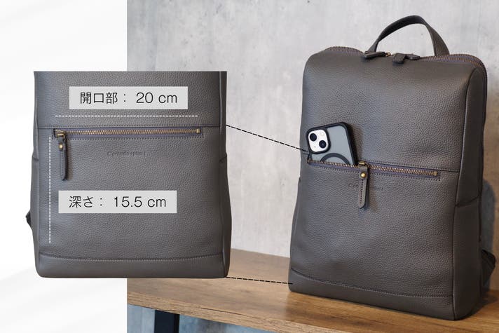 フロントファスナーポケット:開口部20cm、深さ15.5cm
