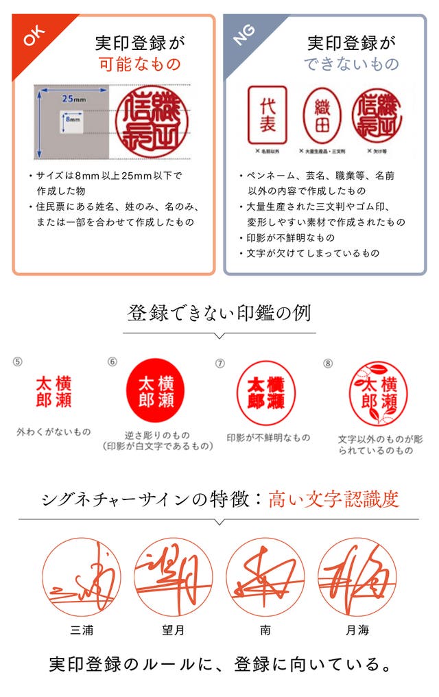 認印・銀行印としての使用に加えて、実印としての登録も適しています。実印登録において重要なのは、図鑑化されないことと、文字が一定程度判読可能であることです。この手書き文字はその基準を満たすことができます。※各自治体に事前にデータサンプルをご確認いただくことをおすすめいたします。