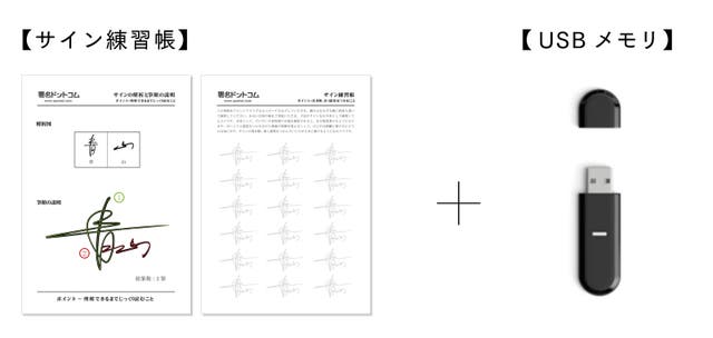 デザインした印影をサインとして使っていただくために、オリジナルのサイン練習帳もセットでご用意しています。それだけでなく、デザインした印影やサインを電子データとして使っていただけるよう、64GBサイズのUSBフラッシュメモリに収録してお届けします。