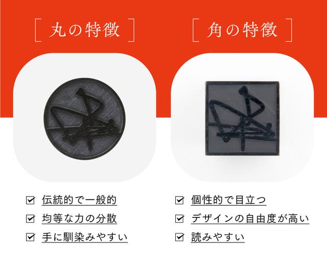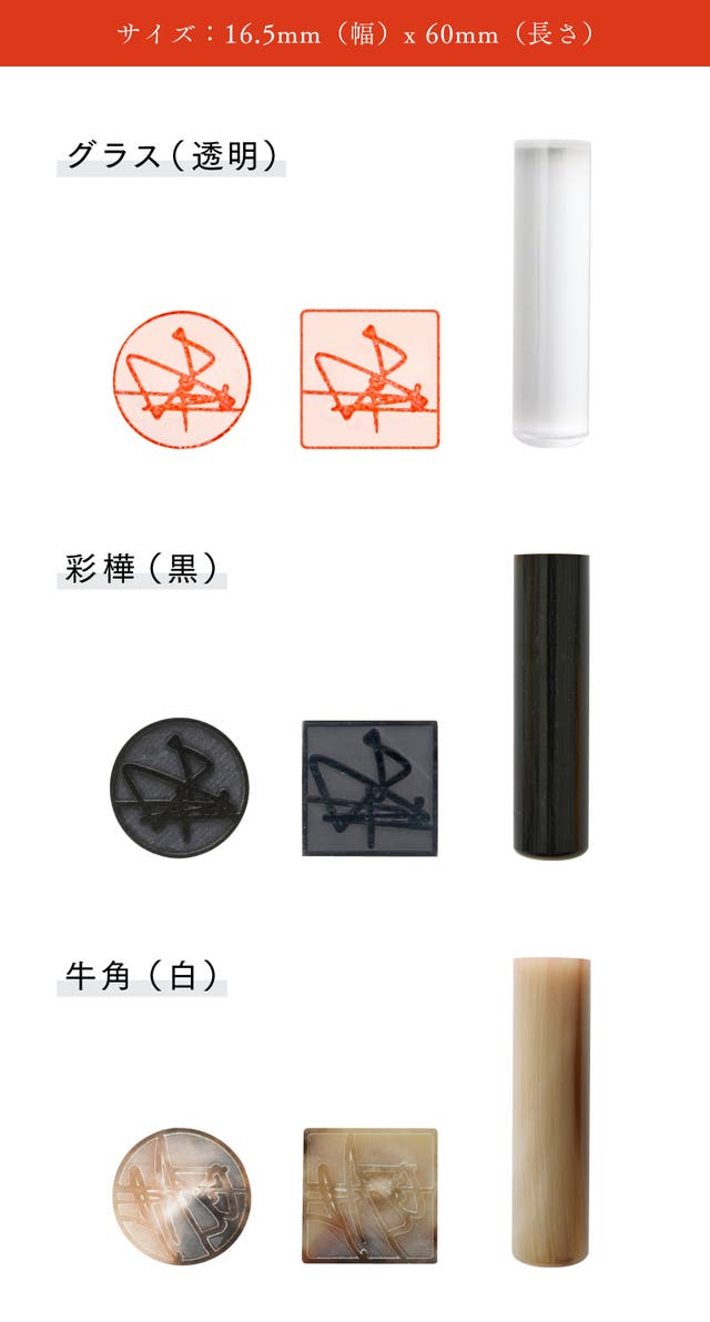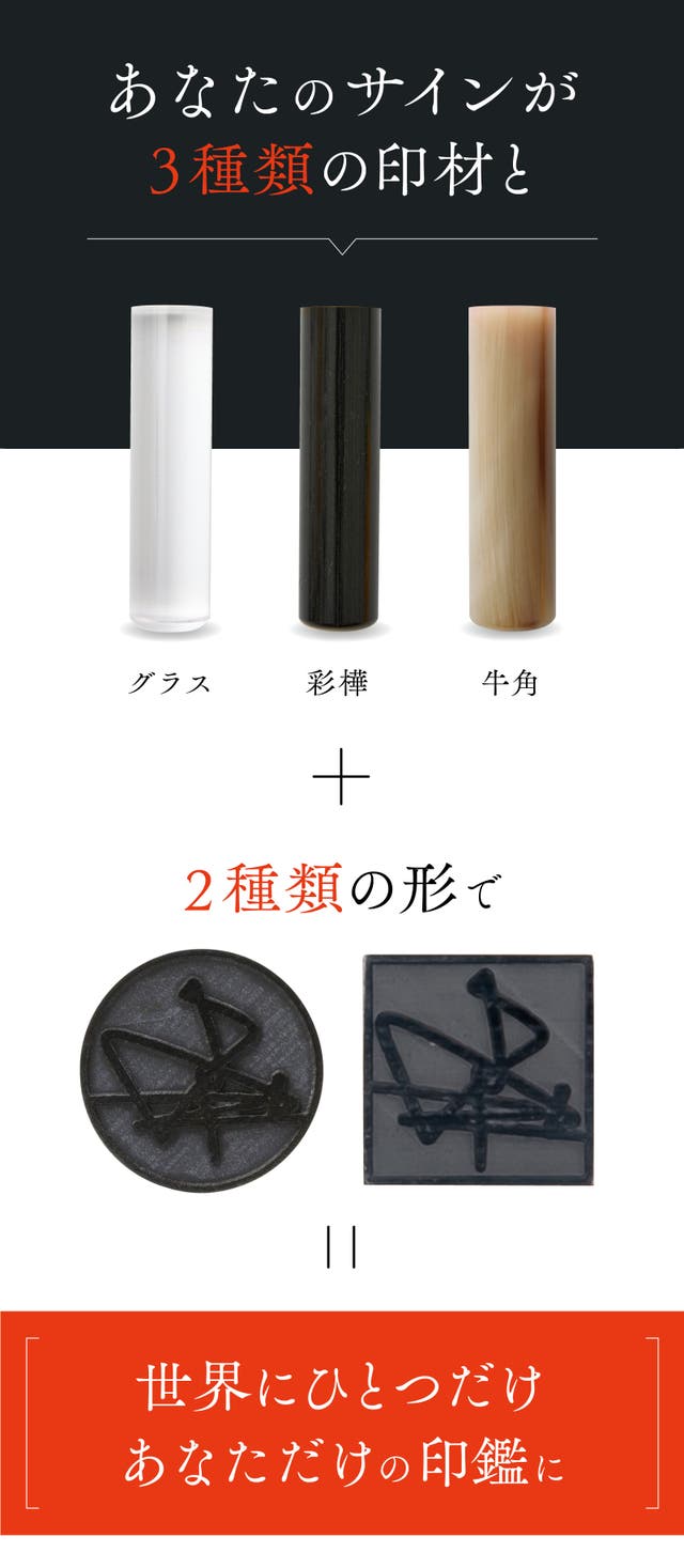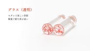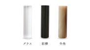 印鑑の材質は、モダンなイメージの透明な「グラス」、穏やかで重みを感じる黒の「彩樺」、そして高級感があり長期保管に強い天然素材の「牛角」からお選びいただけます。また多様な印影を表現するために、印面の形は「丸」と「角」からお選びいただけます。