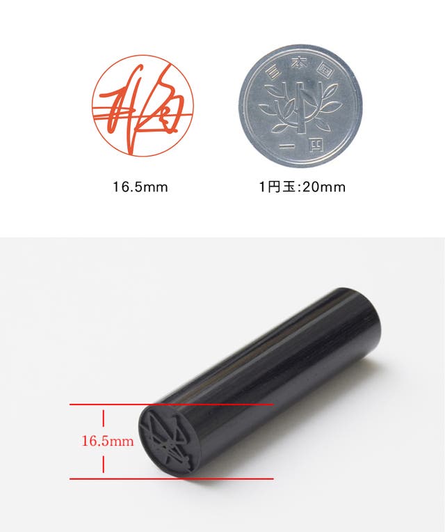 一般的な印鑑のサイズは10.5mmから18mmです。女性用の印鑑は男性用よりひと回り小さいことが多いですが、その中でも16.5mmは男女ともに持ちやすいサイズです。また、試作を重ねた結果、16.5mmサイズは今回デザインしたサイン文字を鮮明かつバランスよく映し出すことができることがわかりました。