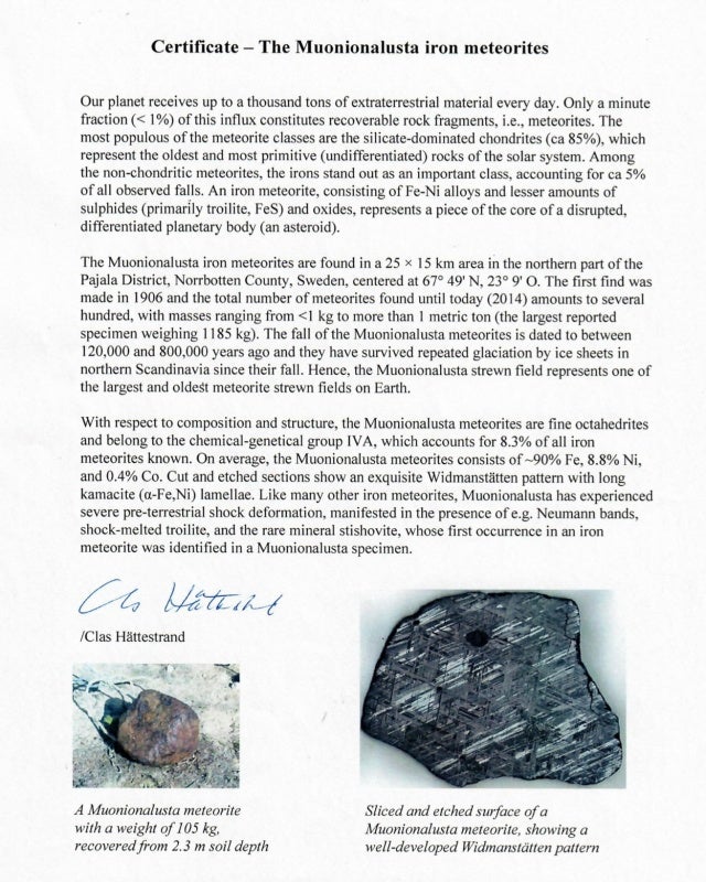 ウィドマンシュテッテン構造は形成された環境やメテオライトの位置によっても変わるため全てが1点物となっております。現状、この特殊な模様は人工的には作りえないため、模様の存在そのものが隕石の証明でもあります。