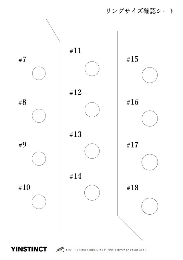 リングサイズのご確認はお近くのジュエリーショップ、または、以下の画像をA4サイズの用紙にて印刷したものをカットしてご使用ください。太めのリングでは、普段ご使用のリングよりも少し余裕のあるサイズがおすすめです。
