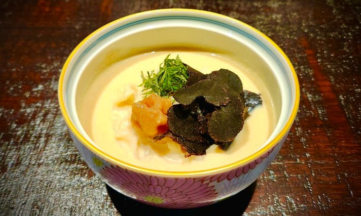 牛からじっくりと出した栄養満点のスープに、季節のポルチーニ茸と鮑をまるごと使用した餡をたっぷり包んだ、もっちりな自家製韓国式餃子「マンドゥ」を添えた、身体温まる滋養強壮料理です。