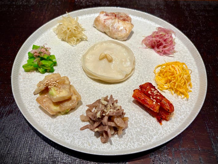 吟味した食材を、日韓それぞれの調理法で仕上げた九つのお料理が集まった、日本料理での八寸のような繊細な技法と季節を感じられる韓国宮廷料理、見せ所の一品です。