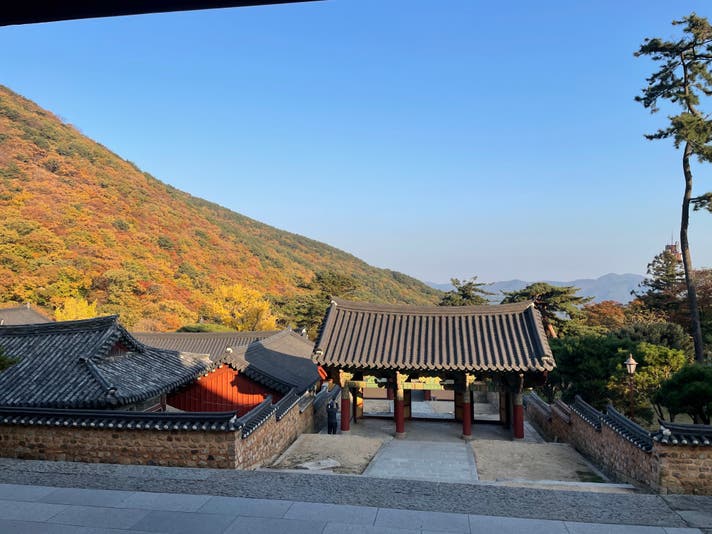 ↑韓国南部、釜山地域のお寺にて。韓国の寺院は基本的に山の上にある事が多く、景色も良いです。
