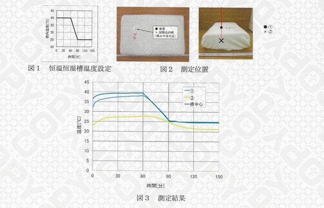 試験項目、及び試験方法:デジタル温湿度計にて測定開始前の試験室内の温湿度を測定後、デジタル温湿度計のセンサ部を試験品に設置し、図1のように安定した恒温恒湿槽に投入して、図1の120分・240分・360分・480分時の温湿度を測定した。(図1)