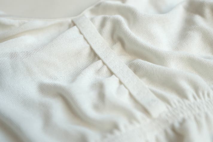 横方向への伸縮性が大きいニット生地のため、体の動きに合わせて柔軟に伸び縮みし、肌に心地よくフィットシルク繊維本来の滑らかさと、編み物ならではの柔らかさが組み合わさり、雲のような、とろけるような肌触りを実現