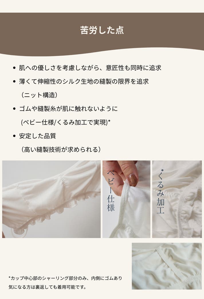 そんな思いで始めて、ワイヤーブラを中心に生産をしてきましたが、下着のお悩みの声に応えるべく誕生したのがシルクレイヤードブラの始まりです。