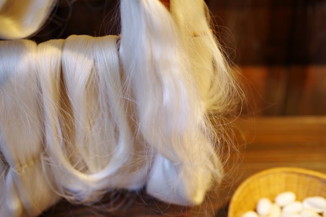 シルクは通年素材です。特に、絹は熱伝導率が低いので、冬は暖かく、夏は涼しく使うことができます。吸湿性・放湿性が高い絹は、夏の暑い日に汗をかいてもすぐに外に放出してくれるのでサラッと爽やかに首に巻くことができます。