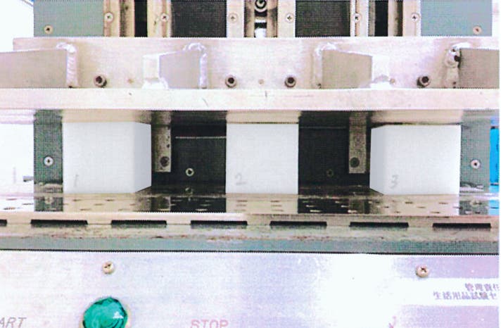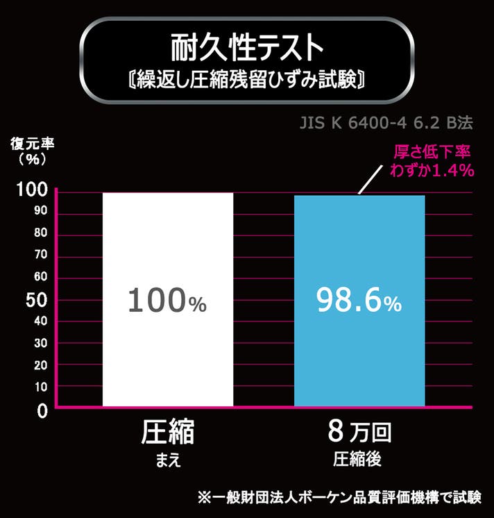 JIS K 6400-4:2004 6.2B法(定変位法)試験片全体を、厚さの50%まで連続80000回繰返し圧縮することによって発生する厚さの低下率を求める。