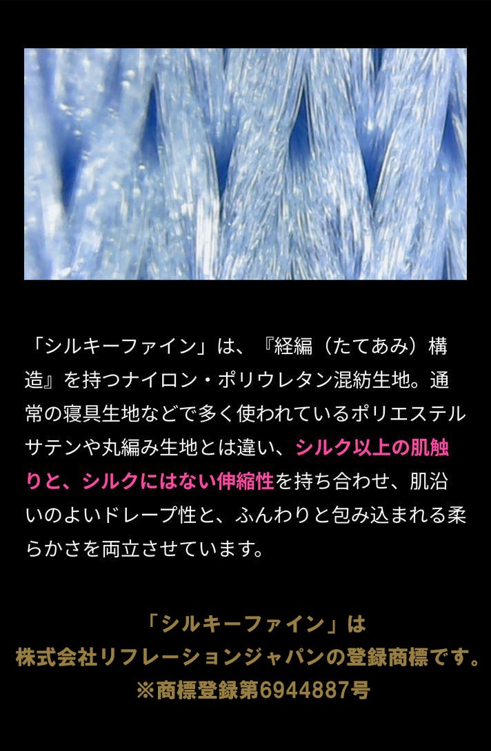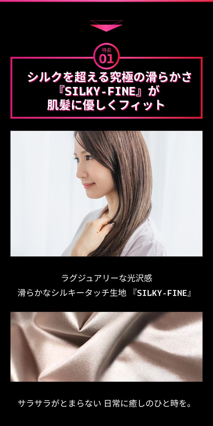 シルキーファインの生地は低摩擦素材なので、肌や髪にも優しく触れてくれます。