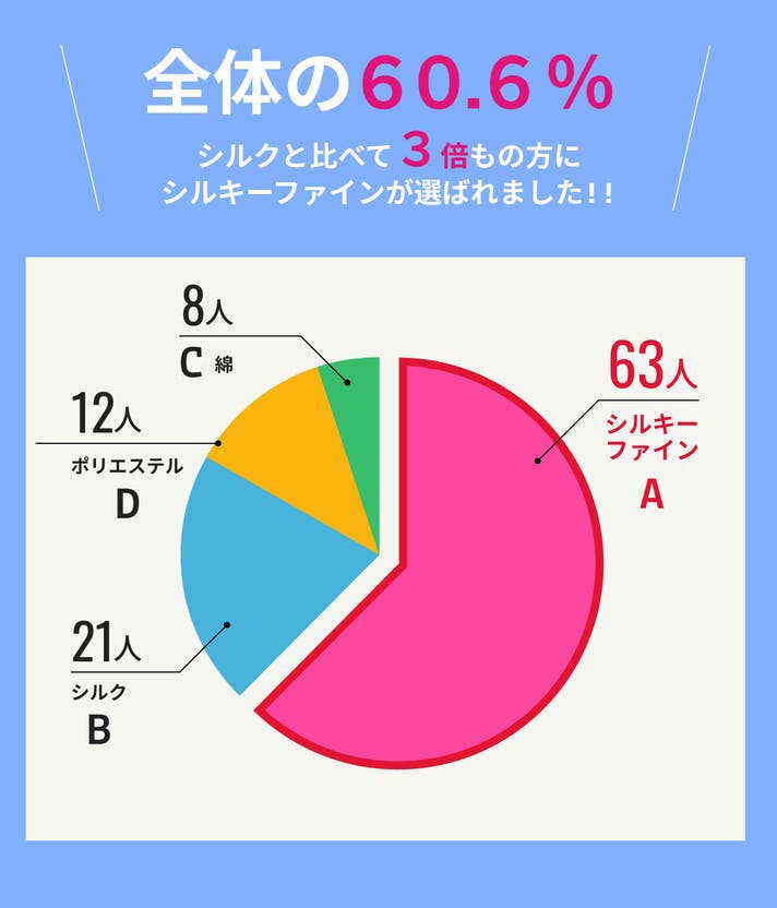 4種類の中には本シルク生地もある中で、老若男女104人中、断トツの63人が「一番気持ちいい」と回答。データでも体感でも、しっかりと裏付けられたました!誰が触っても「違いが分かる」心地よさが、多くの人に支持されています。