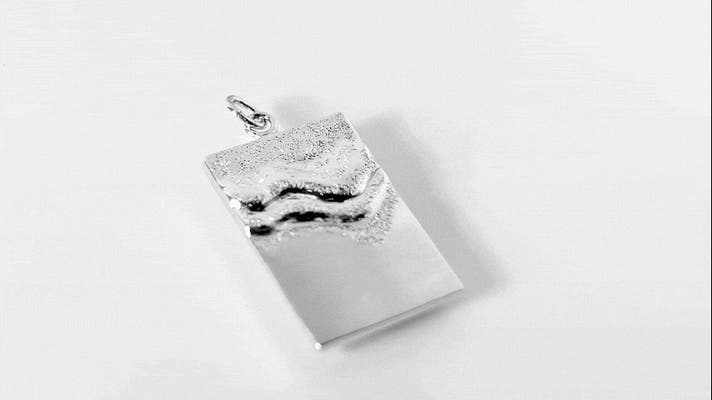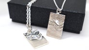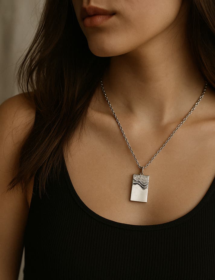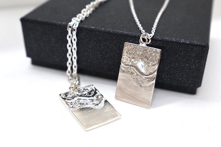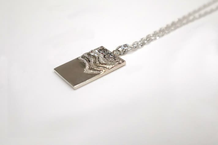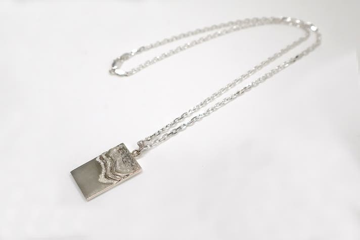 - 波の揺らぎを写した銀板にQRコードで本物の波音を込めた三感アクセサリー。