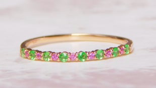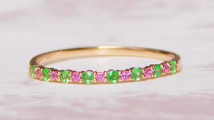 *左のリングはツァボライトとロードライト、 右はピンクスピネルとタンザナイトです。とても華やかなエタニティーリングだと思います