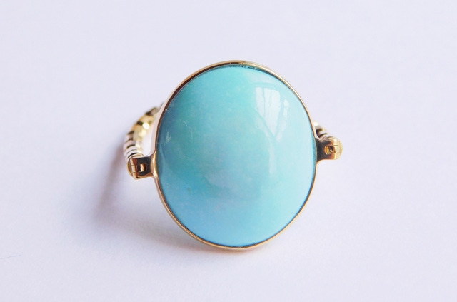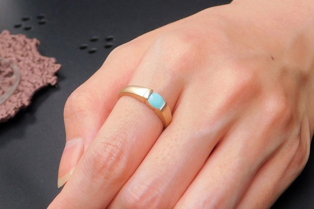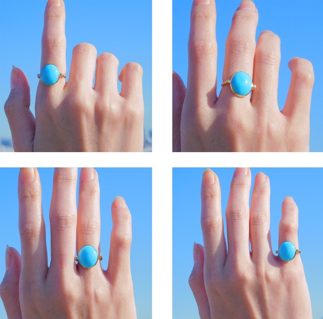 キラキラ系の宝石ですと、あまりにも大きいとちょっとイミテーションぽく見えたりしますが、スリーピングビューティーターコイズはそんなことはありません
