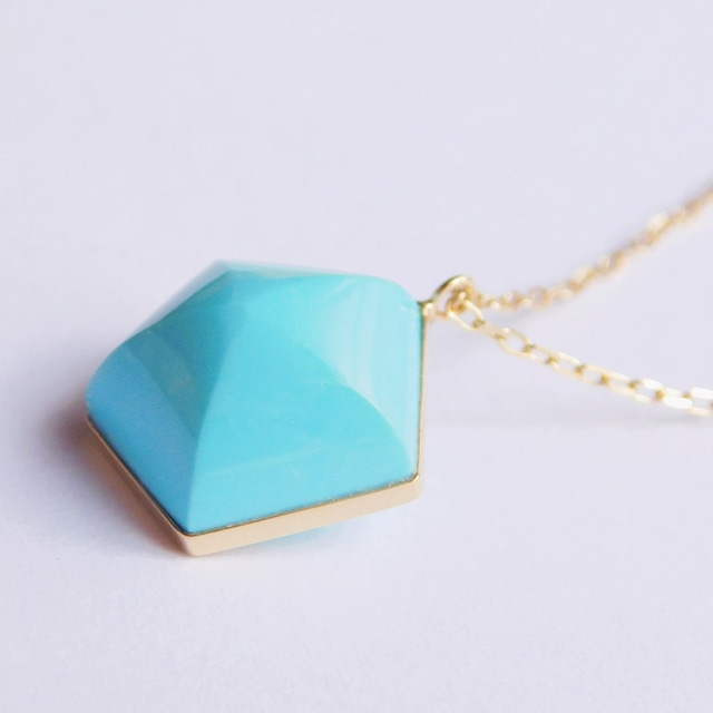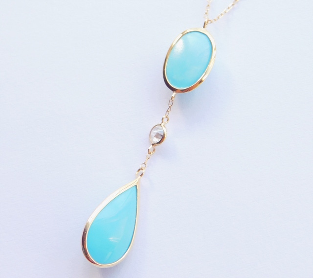 スリーストーンネックレスの最後にご紹介させて頂きますのは、上下共に1粒石ネックレスに小さいグループに使用していますターコイズと同じぐらいの大きさのものを使用した、存在感あるネックレスです