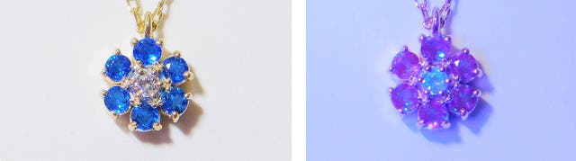 と、常日頃からネオンブルーに変化するダイヤモンドは探し、ストックしていますので急遽両方変化するレアなジュエリーを作ることにしました