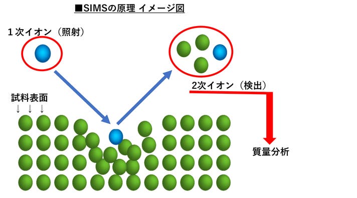 SIMS(二次イオン質量分析装置)は、物の表面を少しだけ削って、その中に含まれる元素を詳しく調べることができる分析装置です。