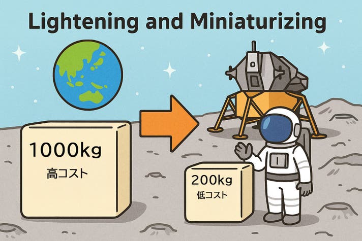 現在、世界で稼働している二次イオン質量分析装置(SIMS)は非常に大型で、装置全体の重量は1,000kgを超えます。しかし、月面に1kgの物資を運ぶためには約1億円のコストがかかるとされており、仮にそのままのサイズで輸送すれば、輸送費用だけで1,000億円にも達してしまいます。これは現実的な金額ではありません。