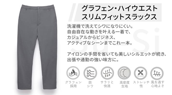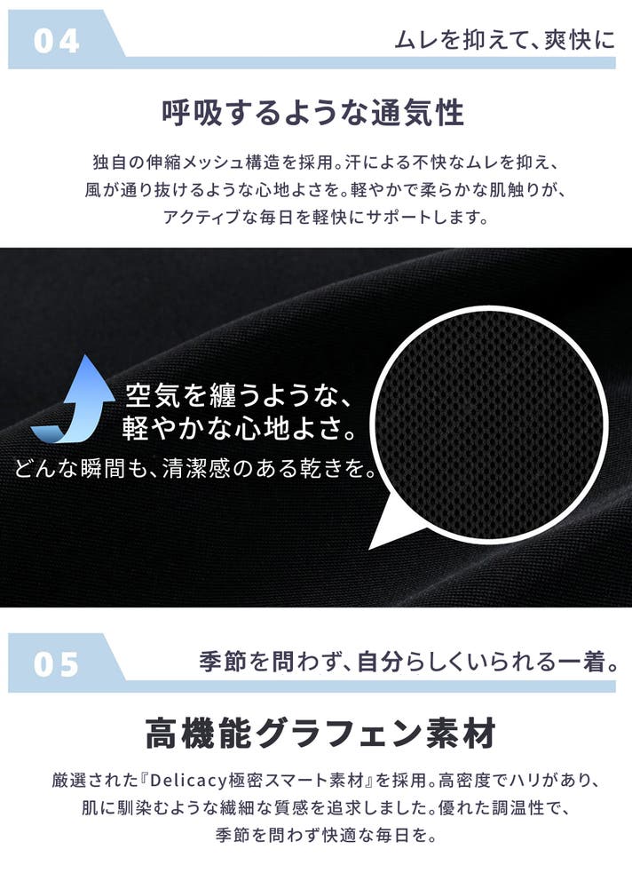 - 人生に最適温度を。グラフェンの高熱伝導でムレにくく、冬は蓄熱で暖かい究極の着心地。