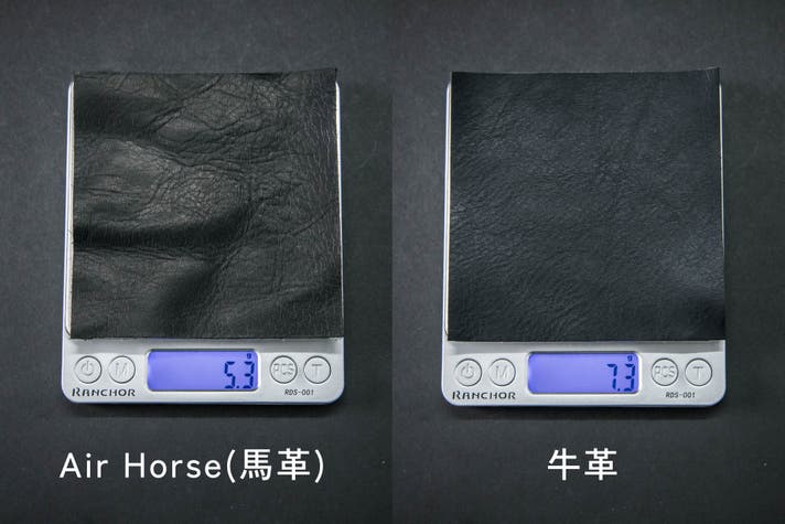 同じ厚みの牛革(ミネルバボックス)と今回使用している馬革を比較してみると、馬革の方が繊維密度が粗いため約27%程度軽いです。