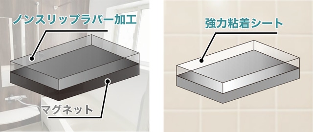 - 『どこでも浮かせる』:マグネット式と粘着シート式の2タイプでほぼ全てのお風呂に対応。