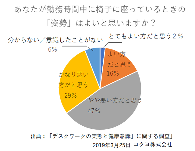 「あなたの姿勢は大丈夫ですか?」と聞かれると多くの方が首をかしげると思います。それもそのはずです。オフィスワーカーの約8割は仕事中に座っているときの姿勢が悪いことを自覚しているのです。
