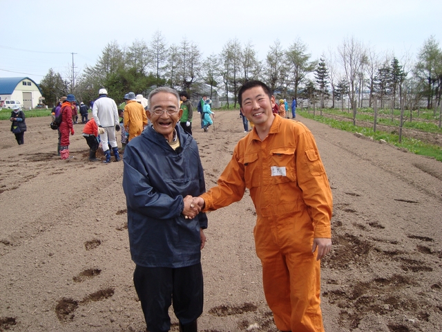 北海道木村秋則農学校で1年間学び、その後の2年間は運営と生徒の中間:ボランティアスタッフとして、奇跡のリンゴの主人公:木村秋則さんから直接指導していただきました。(木村秋則さんに就農することを伝えた後の記念撮影)