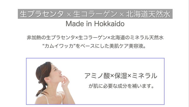 肌に取り込む自然の風、自然の水、自然で育った動物性のプラセンタをそのまま肌からたくさん、たくさん感じていただきたいと思い一生懸命作りました。生まれたての肌のような美肌を再び手に入れてください。非加熱プラセンタと生コラーゲン、そしてシラカバエキスとワイルドタイムエキスはカムイワッカの水に溶け込み、角質層まで浸透してゆきます。年齢に応じた毎日のエイジングケア(※年齢に応じたケア)をお楽しみください。是非、普段お使いのお手入れに加えていただき、自然の底力を楽しんでください。きっと新しい朝、新しい肌に出会えます。