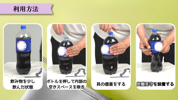 TIP. 残った飲み物の量に応じて2個、3個まで使用してペットボトルの残ったスペースを取り除きます。