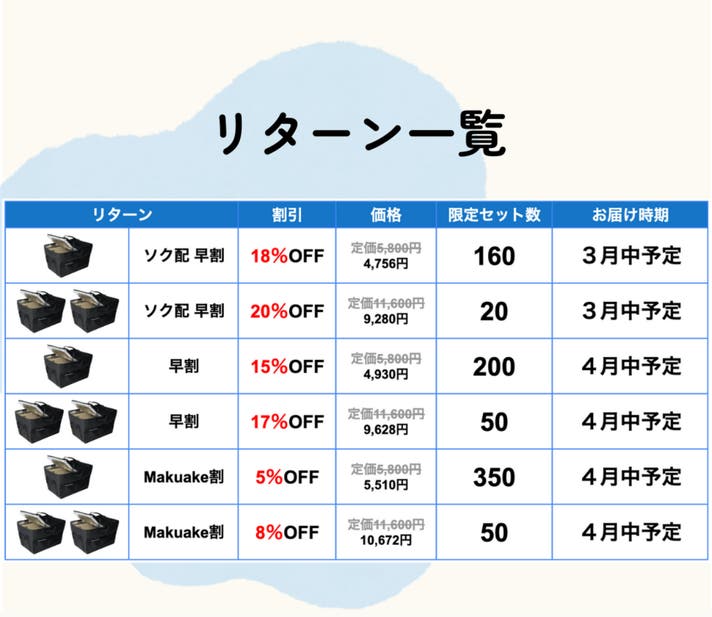 ※皆様の応援購入により量産効率が向上した場合、正規販売価格が販売予定価格より下がる可能性もございます。
