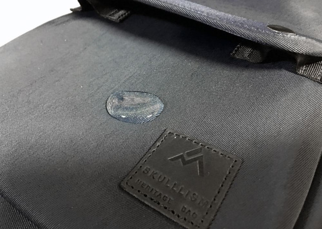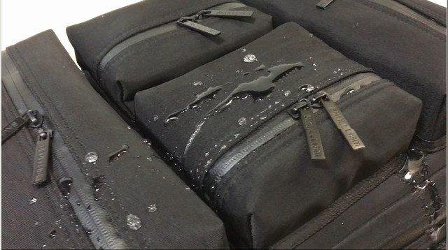 A:防水素材ではないので、長時間水に触れたり浸かったりするような使用方法は出来ません。しかし、移動中のちょっとした雨や水しぶきなどには強く、かかった水しぶきを弾いてくれます。バッグについた水しぶきは手で払ったり、さっと拭くときれいに無くなります。