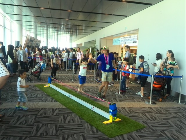 ▼下記画像は2015年5月、羽田空港国内線ターミナルでの体験会の様子。期間中約1,500名を超える方がスラックラインを体験してくれました。