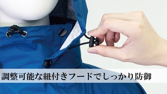 MORRの高めに設計された襟部分と、襟部分に搭載された折り畳み式のフードが首への雨水の流入を防ぎます!また紐で調節可能なので通気性は自分で調節できます。