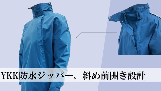 通常のレインウェアは正面にジッパー等がついているのに対して、MORRは斜め開きのジッパーを採用しています。ジッパー部分を斜め開きに設計することで、雨水がレインウェアに溜まったとしてもジッパーを貫通しないので、立膝での撮影、自転車やバイクでの走行時に溜まった雨水がレインウェアの中に入ることを防ぎます。