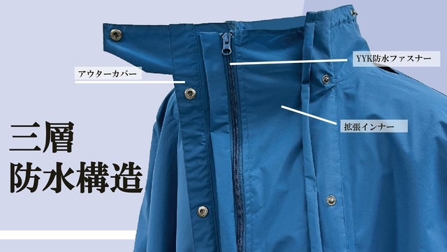 自社のレインウェアの単層防水構造と比べ、MORRは防水ジッパー、拡張インナーとアウターカバー部からなった三層構造で、しっかり雨水を外部に遮断できます。