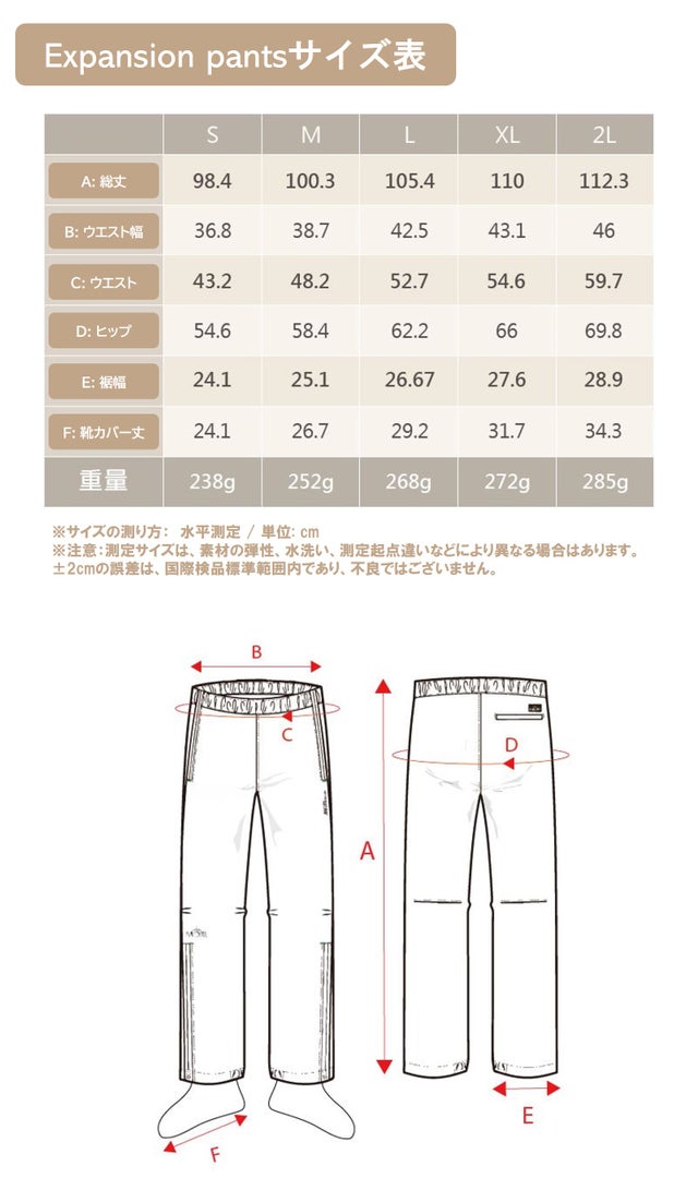 ややルーズなExpansion pantsを選定すれば、普段のパンツと重ねて着用することも可能です。自分の好みでサイズを選定してください。