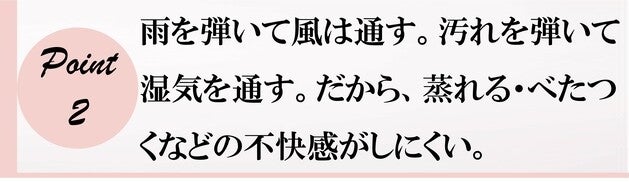 - 雨は弾いて風は通す。汚れは弾いて湿気は通す。だから撮影やアウトドアなど動く場面でも快適に。