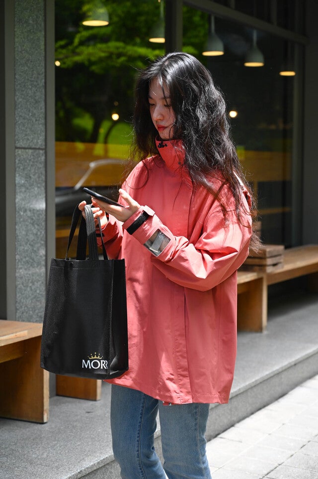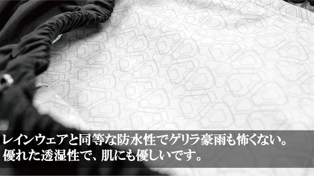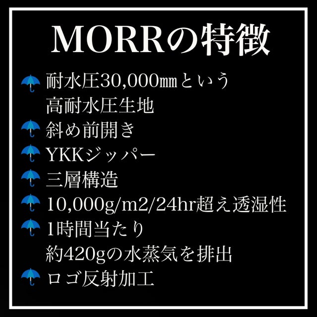 一般的なレインウェアは耐水圧10,000㎜以下で作られていることが多く、長時間の大雨、嵐や豪雨などの場合だと雨水が染み込むことがあります。MORRは一般的なレインウェアの3倍以上の実力「耐水圧30,000㎜」という高耐水圧生地を使用しています。MORRを着たままシャワーを浴びても中の服は濡れないほどの耐水性を誇っています!