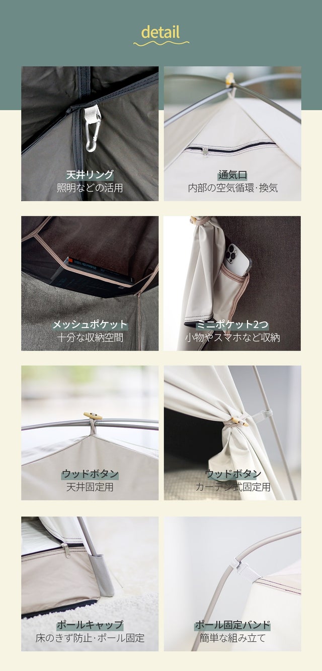 - ベッドや床などお好きな場所に5分で簡単組み立て、自分だけの安らぎの空間を作ってみてください!