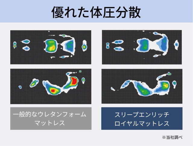 仰臥位では、臀部への圧力集中が緩和され、さらに腰部の浮きが無くなる事で身体全体を「ロイヤル」が支えます。側臥位でも同様に肩部や腰骨にかかる圧力を低下させ身体への負担を軽減させます。