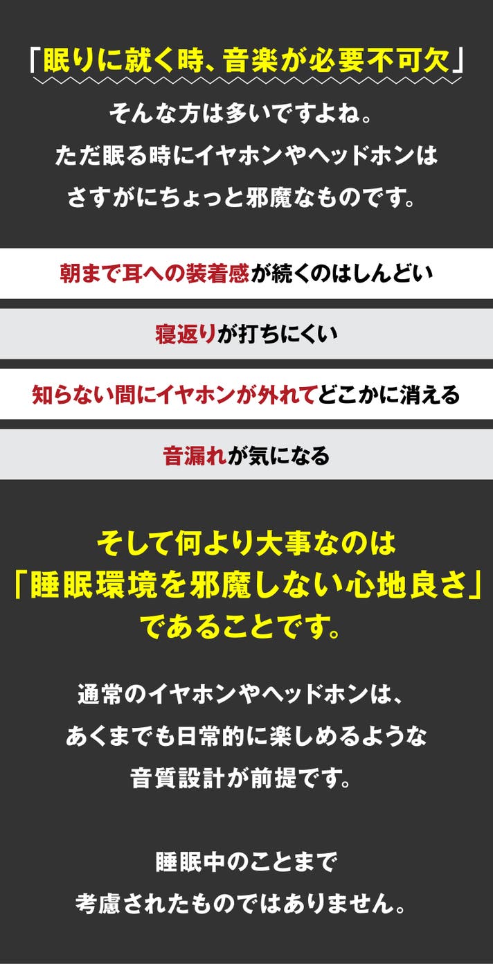 「これは目に見えないほど小さなスピーカーですが、その存在感は、きっと毎晩あなたの眠りの中で実感していただけるでしょう。」