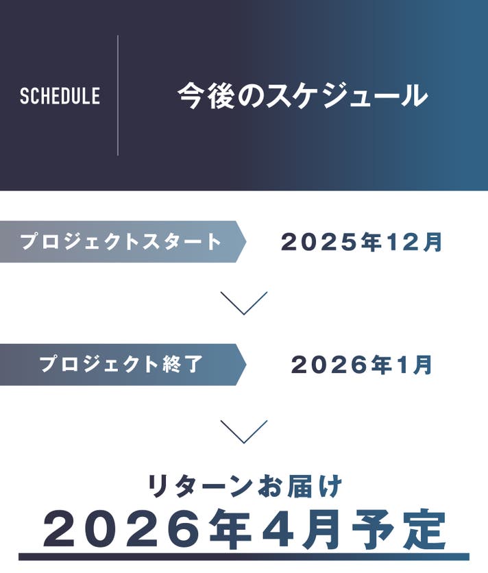 このプロジェクトはAll in型です。目標金額の達成に関わらず、プロジェクト終了日の2026年01月18日までに支払いを完了した時点で購入が成立します。