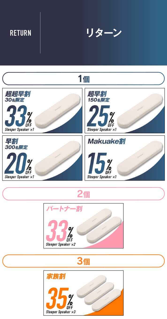 プロジェクトに関する情報 ・プロジェクトの属性:輸入商品 ・代理店によるサポート:製品保証1年間 ・プロジェクト実行者(国):日本 ・製品者(国):アメリカ ・製造者(国):中国 ※並行輸入品が発生する可能性があります。正規以外での個人輸入等は、完全に防ぐことができない場合がございます旨、予めご了承のほどお願いいたします。 ※リターン品の配送が完了するまで、WEALTH BASEはsleeperの日本における独占販売権を有する正規代理店です。並行輸入品が発生する可能性がございますが、並行輸入品には正規代理店による製品サポートを受けることができません。 また、正規代理店を通じて購入することで、日本国内での流通に必要な各種認証の取得や、関税の適切な処理が担保されます。 ※一部国内に類似商品が出回っている場合がございます。弊社では他社の類似品に関してのお問い合わせには対応できませんのでご了承ください。 ※使用感などに関しては、感じ方に個人差が予想される製品でございます。そのため、使用感等に関する返品・返金はお受けいたしかねます。 ※初期不良以外に関する返品・返金はお受けいたしかねます。 ※デザイン・カラー・素材などの仕様が一部変更になる可能性がございます。 ※モニター環境によって、画像の色が実物と異なって見える場合がございます。 ※応援購入の数が想定を上回った場合、製造工程上の都合等により出荷時期が遅れる場合がございます。 ※皆様から想定を上回る応援購入を頂き、量産体制を更に充実させることができた場合、一般販売価格が予定価格を下回る可能性がございます。 ※本プロジェクトはアンコールプロジェクト(*)の実施可能性があります。 (*)アンコールプロジェクトとは、実施したプロジェクトが好評だった場合において、当該プロジェクトが終了後に再び数週間から数ヶ月程度実施するプロジェクトを言います。 アンコールプロジェクト実施の場合、本プロジェクトとアンコールプロジェクトで同じ配送月を設定する可能性もございますが、本プロジェクトのサポーターを優先して配送いたします。 ※本文中に記載させていただいたスケジュールは、あくまでプロジェクト公開時点の予定です。応援購入の性質上、配送遅延のおそれがございます。原則として、配送遅延に伴う応援購入のキャンセルはできませんが、リターン配送予定月から3ヵ月を超えた場合には、希望者に限りキャンセルにて対応させていただきます。 以上の注意点につきましてあらかじめご理解とご了承いただいた上で応援購入くださいますよう、よろしくお願い申し上げます。 最後に、本製品を手に取った皆様に喜んでもらえるよう、チームメンバー一同心を込めて対応していきますので、 応援よろしくお願い致します。