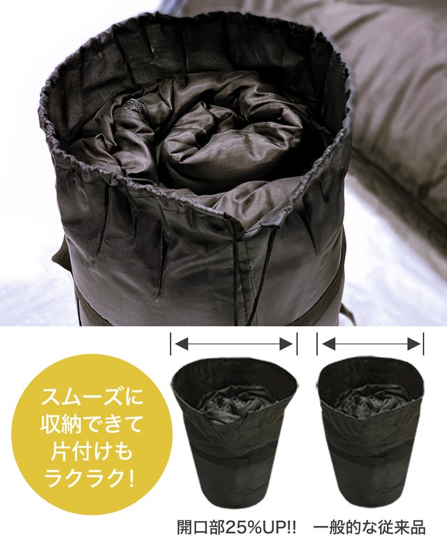 寝袋の片付けにくさを解消するために作られた「V case 」。培った経験や、過去に頂いたお客様の声を反映しました。寝袋の1番のイライラポイントである「収納のしにくさ」を改良し収納袋の入り口にV字カットを入れることで、折り畳んだ寝袋を崩す事なくしまうことができます。一気に片付くので時間の短縮にもつながります。